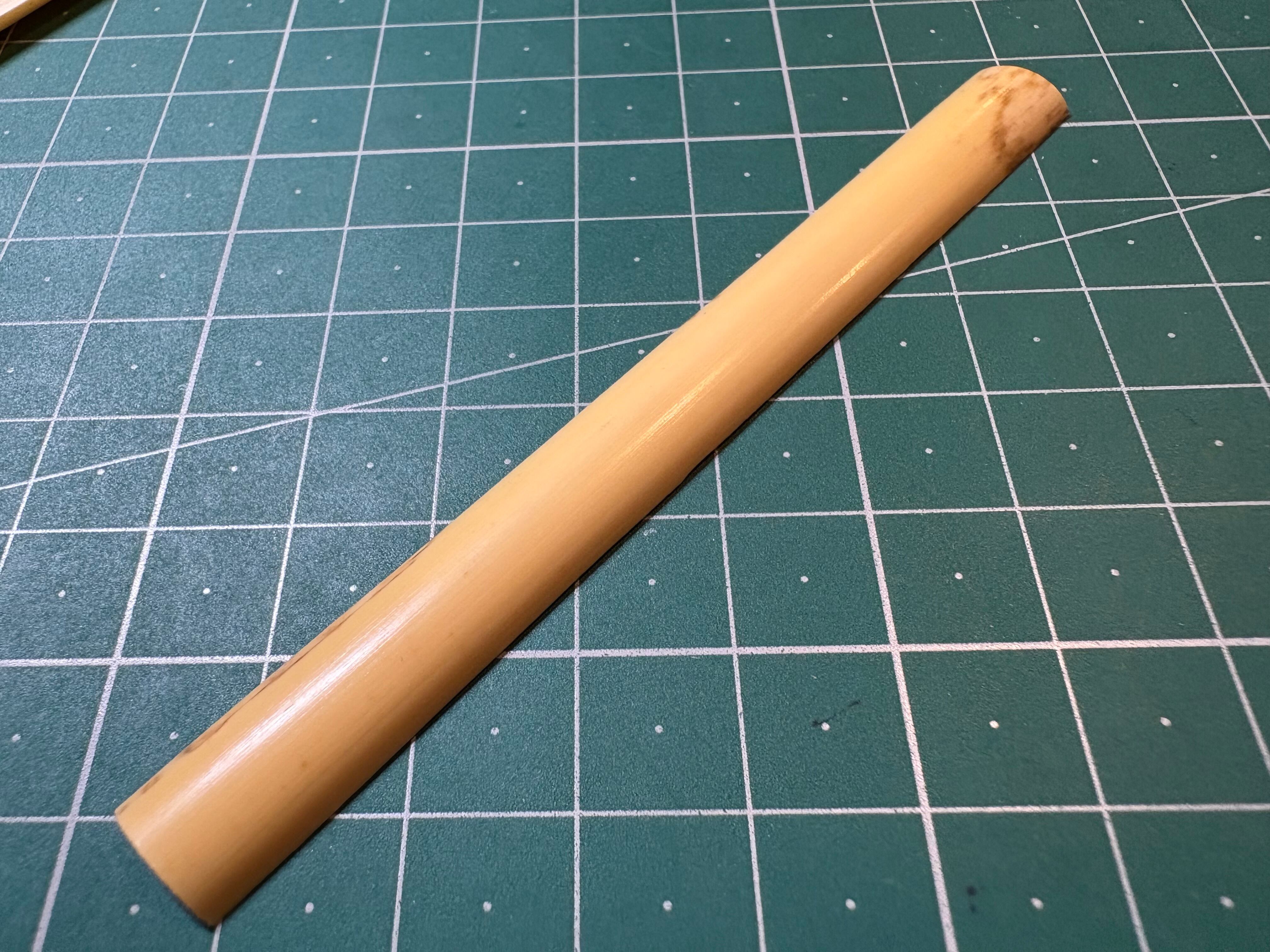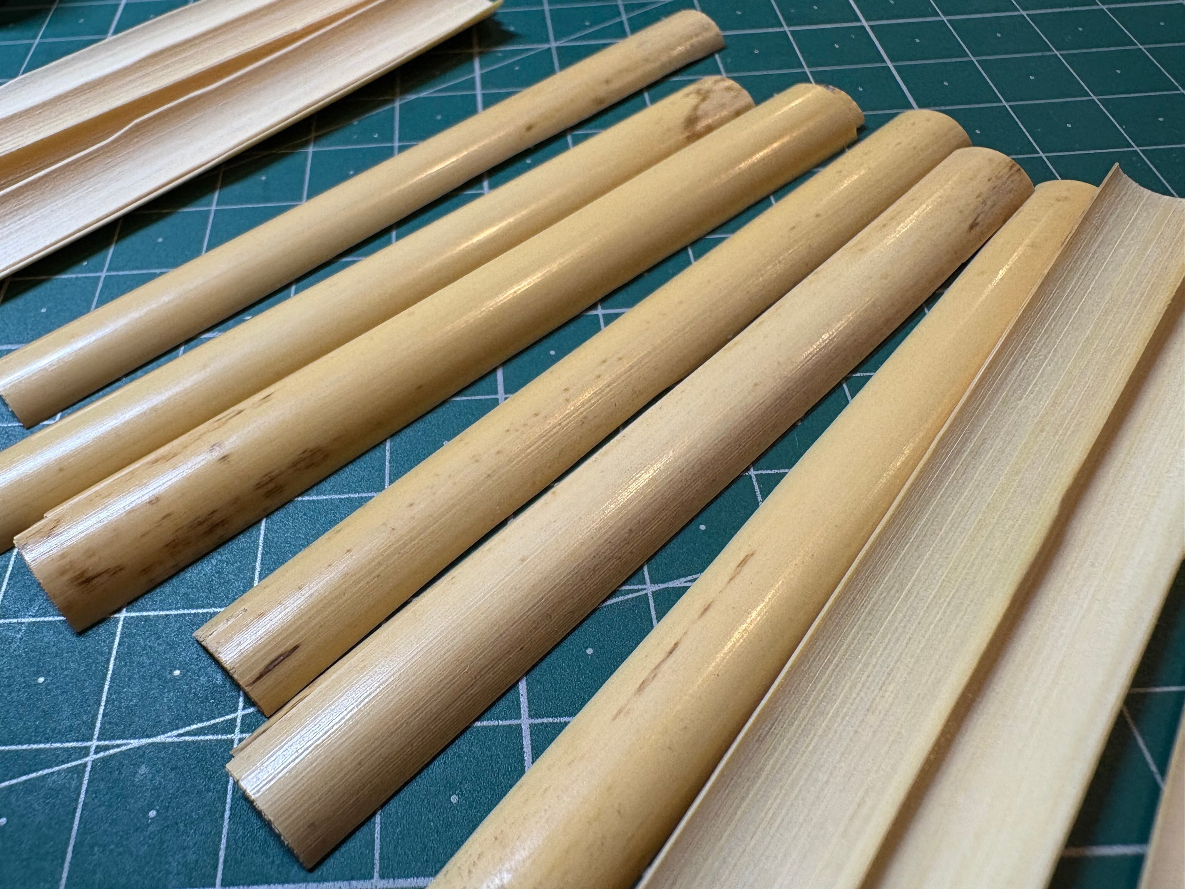 大変好評をいただいております、当アトリエのイングリッシュホルンリードのカマボコ型ケーンです。あらゆるメーカーの材料を試した結果、「密度がしっかりとあり硬すぎず柔軟性に富んでいる」この材料に辿り着きました。直径は11,5-12,0mm、ガウジングの厚さは0,70mmほどです。ぜひお試しください。